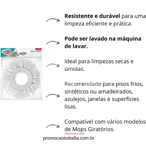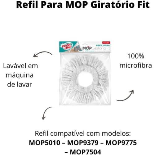 Refil Para Mop Giratório Fit Flash Limp O Refil para Mop Giratório Fit é lavável e 100% microfibra. Produzido com microfibra de alta qualidade, esse refil destaca-se pela sua capacidade de atrair e reter poeira, sujeira e partículas pequenas durante o processo de limpeza. Possui alta durabilidade o que garante que o refil possa ser utilizado repetidas vezes, mantendo sua eficiência ao longo do tempo. Adequado para os MOPs Giratórios, modelos MOP5010, MOP9775, MOP9379 e MOP7504 Ideal para limpeza de pisos frios, sintéticos ou amadeirados, também azulejos, janelas e superfícies lisas! Resistente e durável, fácil de limpar, basta colocar em sua máquina de lavar! DIMENSÕES E PESO: Comprimento: 35 cm Largura: 35 cm Diâmetro: 4 cm Peso: 100 g Dicas de Uso: Antes de utilizar, verifique se o pano está limpo, pois partículas de sujeira podem riscar a superfície. Lave o pano imediatamente após o uso e deixe secar. Caso o pano seja lavado na máquina de lavar, não utilize amaciantes e nem misture com panos que possam soltar fiapos. Guarde o produto em local seco ao abrigo da luz solar. Mantenha o produto longe de fontes de calor. DIAMETRO DE ENCAIXE 13.5CM *** COMPATÍVEL COM: MOP5010 / MOP9379 / MOP9775 / MOP7504 COMPATÍVEL COM MOP GIRATÓRIO FIT *** Marca: Flash Limp